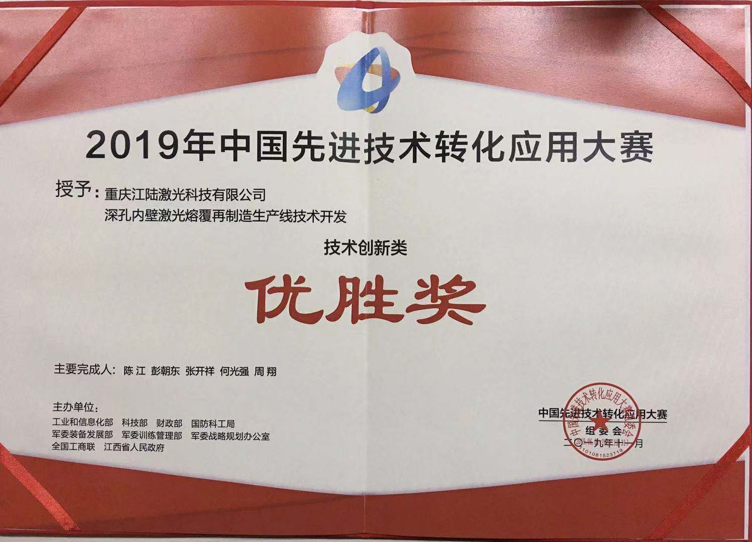 11月19-22日,重慶江陸激光科技有限公司參加了2019年中國先進技術(shù)轉(zhuǎn)化應(yīng)用大賽決賽,通過緊張激烈的角逐,公司深孔內(nèi)壁激光熔覆再制造生產(chǎn)線技術(shù)開發(fā)參賽項目榮獲智能制造技術(shù)創(chuàng)新類優(yōu)勝獎。