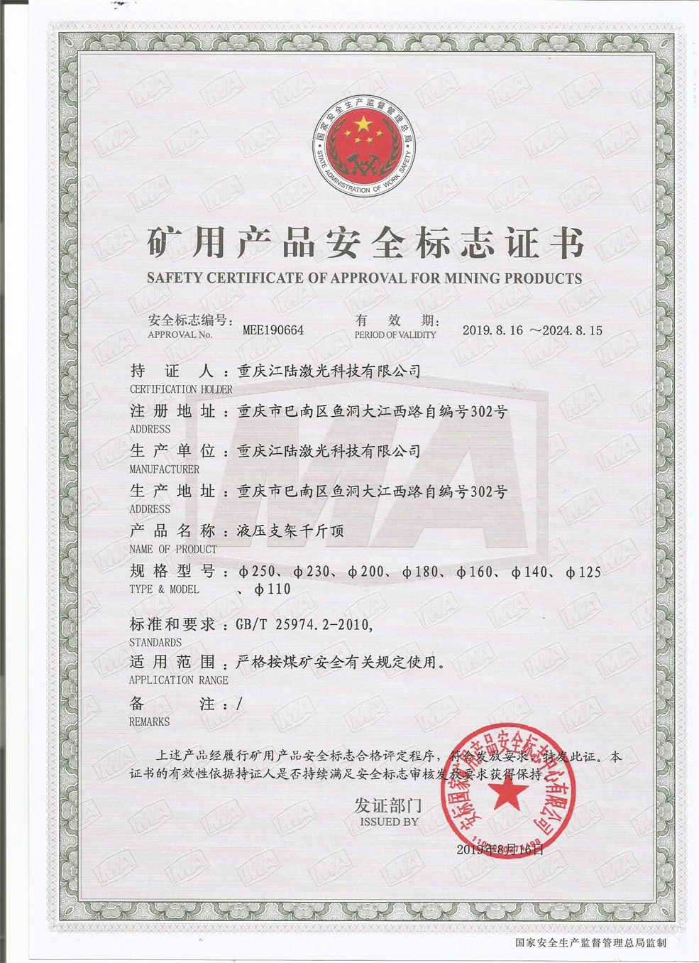礦用產(chǎn)品安全標志證書
